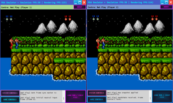 - The emulator synchronizes inputs so both players play the same game together.