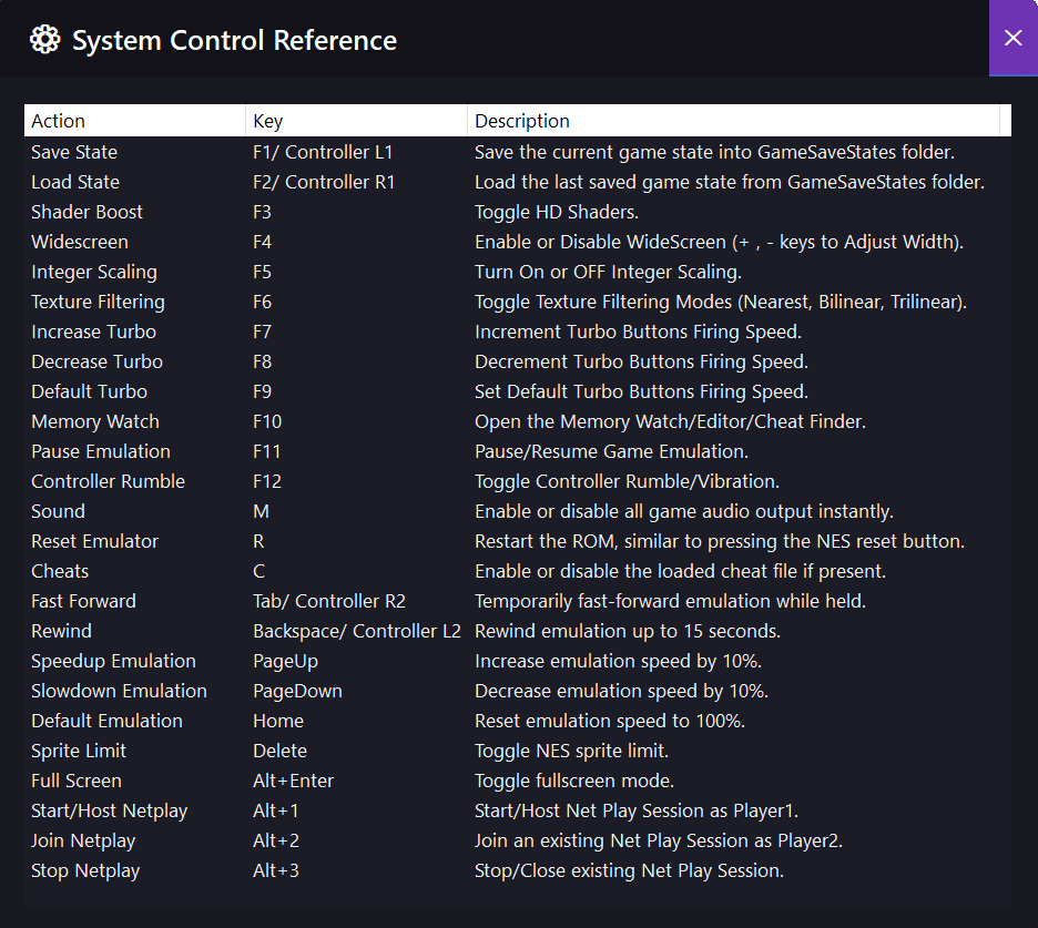 - Page Down — Decrease emulation speed